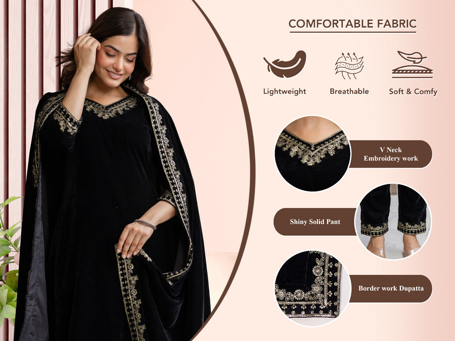 Black Velvet Embroidery Set A line Salwar Suit with Dupatta for Women's