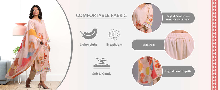 - Style: A Line Kurta Pant Dupatta Set || Work: Digital Print